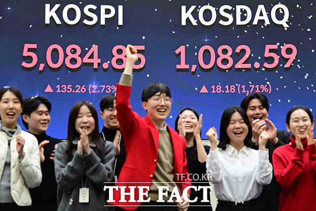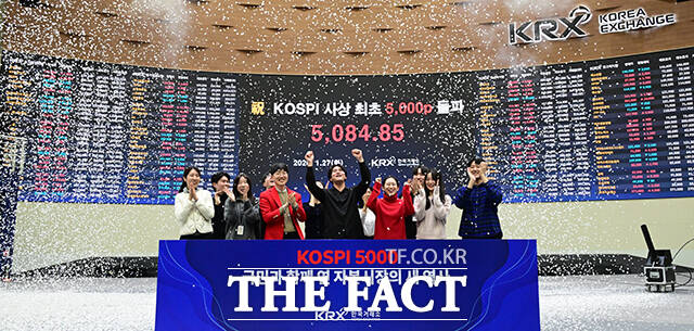 [더팩트ㅣ남윤호 기자] 코스피가 사상 처음으로 종가 기준 5000선을 돌파한 채 장을 마감한 27일 오후 서울 여의도 한국거래소 직원들이 세리머니를 하고 있다. 이날 코스피는 전 거래일 대비 2.73% 오른 5084.85로 장을 마감했다.