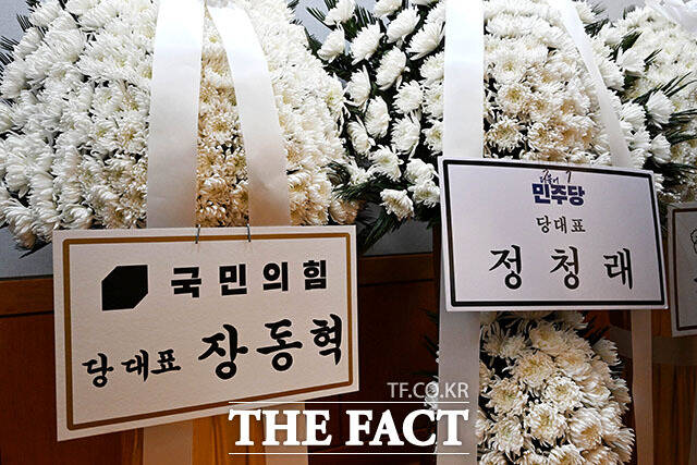 [더팩트ㅣ사진공동취재단] 27일 서울 종로구 서울대학교병원 장례식장에 마련된 이해찬 민주평화통일자문회의 수석부의장의 빈소에 장동혁 국민의힘 대표, 정청래 더불어민주당 대표 근조화환이 놓여있다.