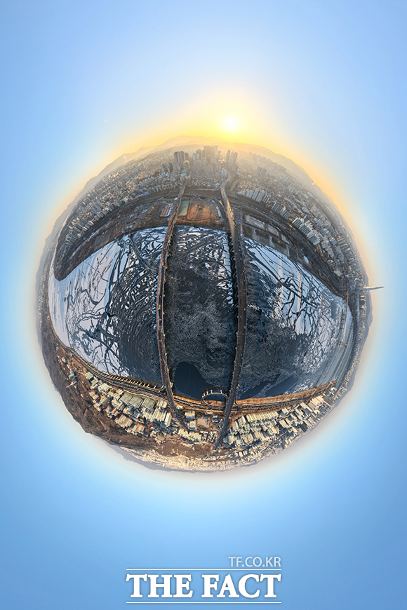 [더팩트ㅣ박헌우 기자] 중부지방을 중심으로 강추위가 이어지고 있는 28일 오전 서울 강동구 광진교 아래 한강이 얼어붙어 있다.