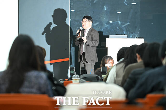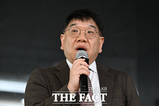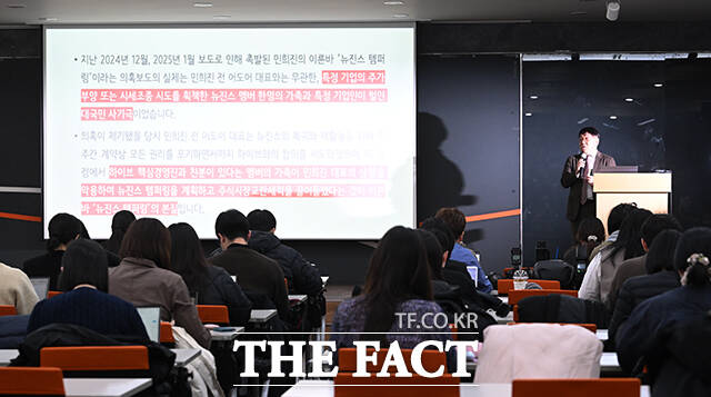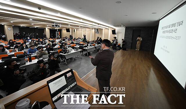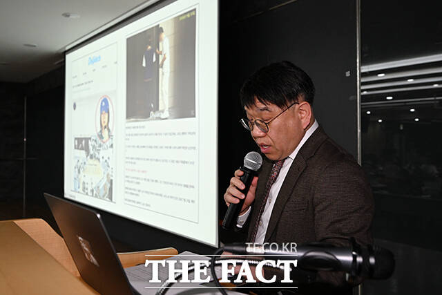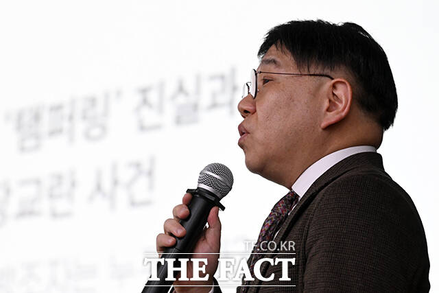 [더팩트ㅣ서예원 기자] 법무법인 지암 김선웅 변호사가 28일 오후 서울 종로구 교원종각빌딩에서 열린 뉴진스 탬퍼링 의혹 관련 기자회견에 참석해 발언하고 있다.