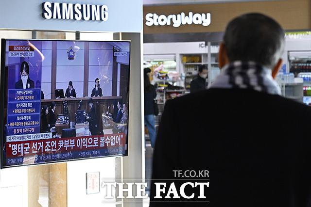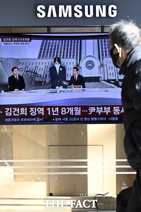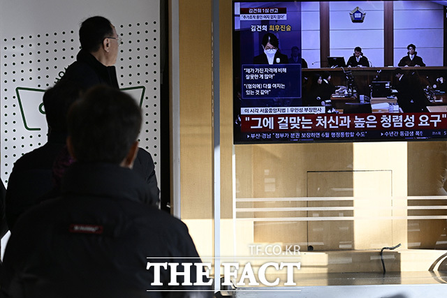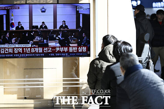[더팩트 | 송호영 기자] 자본시장법 위반과 정치자금법 위반, 특정범죄 가중처벌법상 알선수재 등의 혐의를 받는 김건희 씨가 1심에서 징역 1년 8개월을 선고받은 28일 오후 서울역 대합실에서 시민들이 방송을 지켜보고 있다.