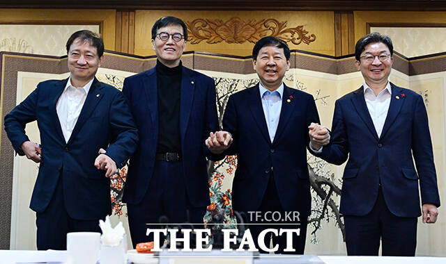 [더팩트ㅣ임영무 기자] 이찬진 금융감독원장, 이창용 한국은행 총재, 구윤철 부총리 겸 재정경제부 장관, 이억원 금융위원장(왼쪽부터)이 29일 오전 서울 종로구 정부서울청사에서 열린 확대 거시경제금융회의에 참석해 기념사진을 찍고 있다.