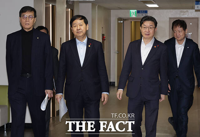 [더팩트ㅣ임영무 기자] 이창용 한국은행 총재, 구윤철 부총리 겸 재정경제부 장관, 이억원 금융위원장, 이찬진 금융감독원장(왼쪽부터)이 29일 오전 서울 종로구 정부서울청사에서 열린 확대 거시경제금융회의에 참석하고 있다.