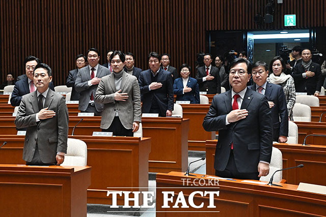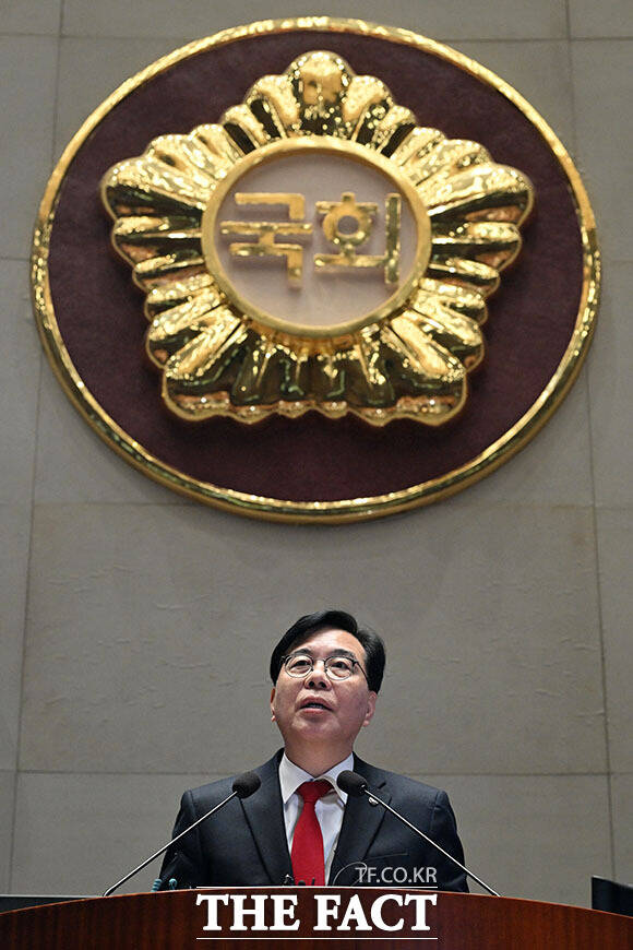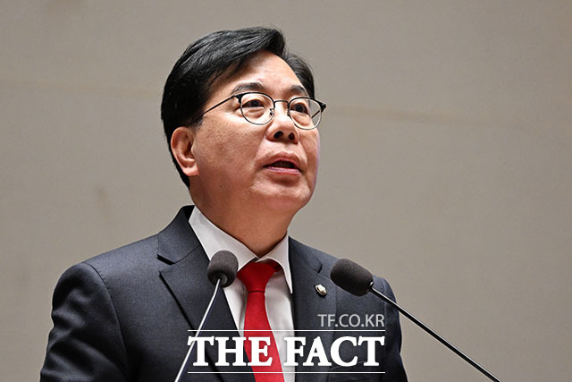 [더팩트ㅣ국회=남용희 기자] 송언석 국민의힘 원내대표가 29일 오후 서울 여의도 국회에서 열린 의원총회에서 발언을 하고 있다.