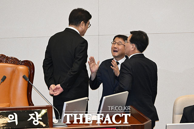 [더팩트ㅣ국회=남용희 기자] 우원식 국회의장과 한병도 더불어민주당 원내대표, 송언석 국민의힘 원내대표(왼쪽부터)가 29일 오후 서울 여의도 국회에서 제431회국회(임시회) 제2차 본회의에서 대화를 나누고 있다.