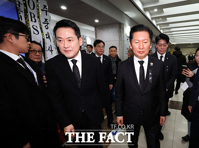 [더팩트ㅣ이효균 기자] 정청래 더불어민주당 대표가 30일 서울 종로구 서울대학교병원 장례식장에 마련된 고 이해찬 전 국무총리의 빈소에서 조문을 마친 장동혁 국민의힘 대표를 배웅하고 있다.