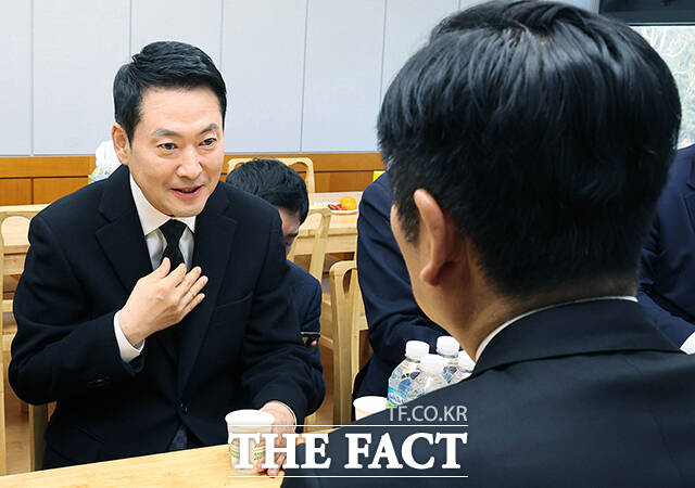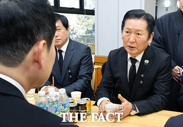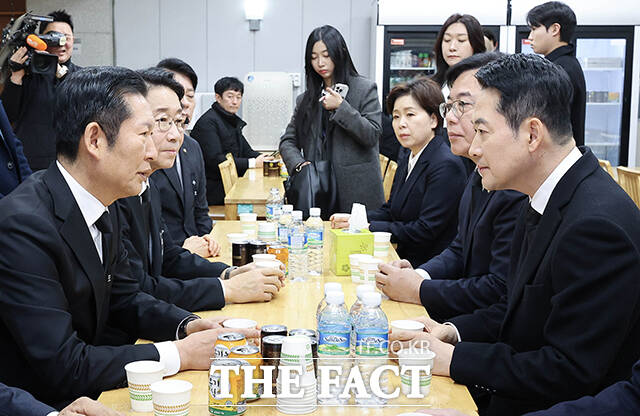 [더팩트ㅣ박헌우 기자] 장동혁 국민의힘 장동혁 대표(왼쪽 두 번째)가 30일 오전 서울 종로구 서울대학교병원 장례식장에 마련된 故 이해찬 전 국무총리의 빈소를 찾아 조문한 뒤 정청래 더불어민주당 대표와 대화하고 있다.