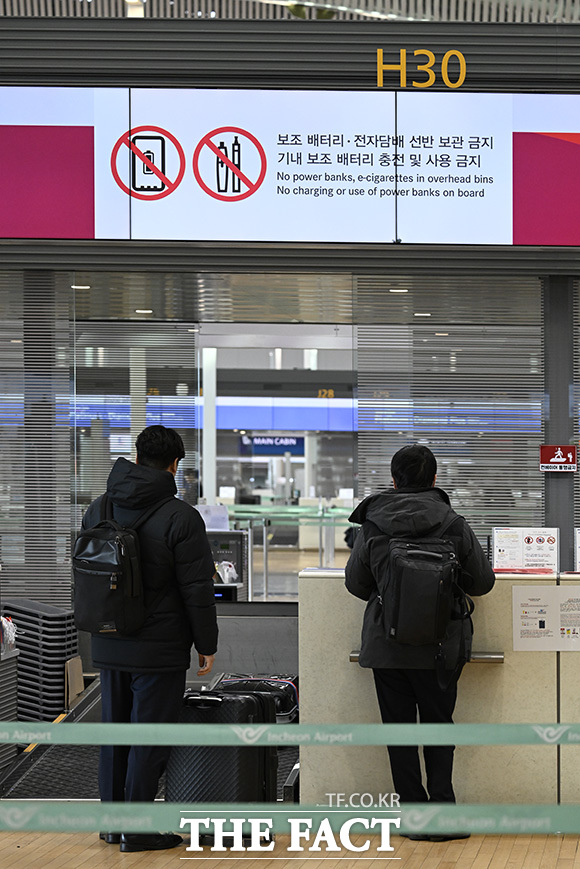 [더팩트 | 인천국제공항=송호영 기자] 대한항공과 아시아나항공 등이 모든 항공기 내에서 보조배터리 사용을 전면 금지한 가운데 30일 오후 인천국제공항 제2터미널 출국장 스크린에 안내문이 송출되고 있다.