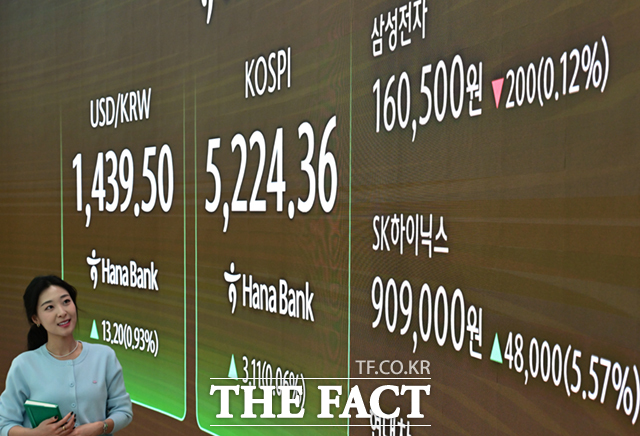 [더팩트ㅣ이새롬 기자] '오천피(코스피 5000)' 이후 7거래일 연속 최고치를 경신하고 있는 30일 오후 서울 중구 하나은행 본점 딜링룸 전광판에 삼성전자, SK하이닉스 지수가 표시되고 있다.