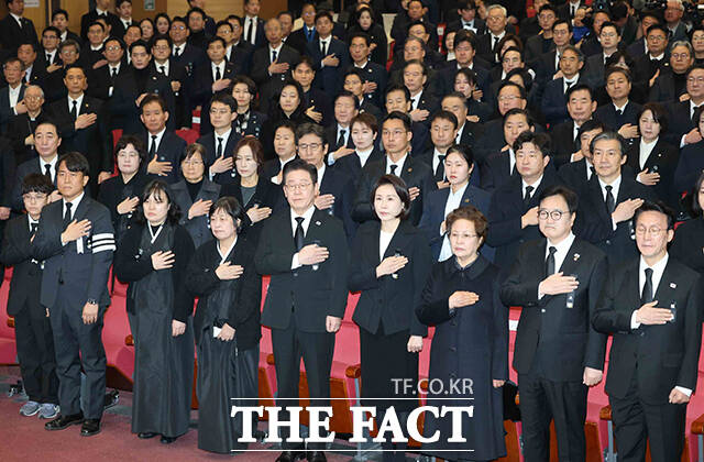[더팩트|국회=박헌우 기자] 고(故) 이해찬 전 국무총리의 영결식이 31일 오전 서울 여의도 국회 의원회관에서 엄수된 가운데 참석자들이 묵념을 하고 있다.