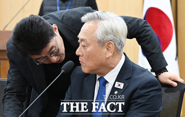 2일 서울 여의도 국회 의원회관에서 열린 더불어민주당 초선모임인 '더민초'의 조국혁신당 합당 관련 의견 수렴을 위한 간담회에서 좌장인 이재강(왼쪽)이 김준혁 의원과 대화하고 있다. /이새롬 기자