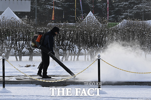 [더팩트 | 송호영 기자] 밤사이 전국적으로 눈이 내린 2일 오전 서울 영등포구 여의도 국회 경내에서 청사 관리자가 기계를 동원해 눈을 치우고 있다.