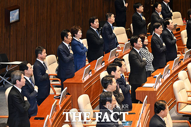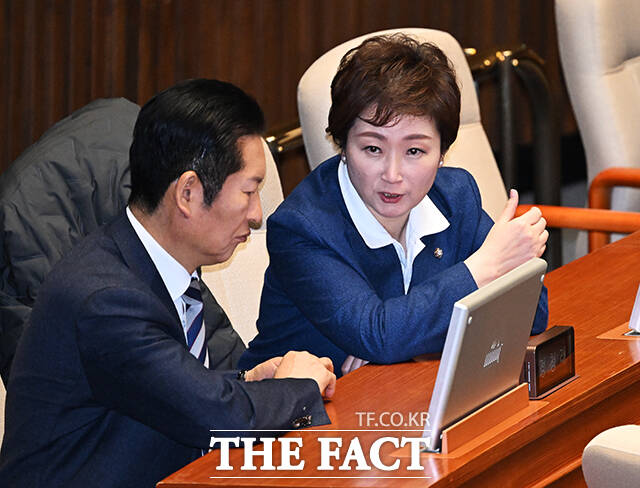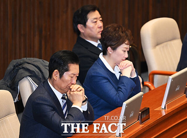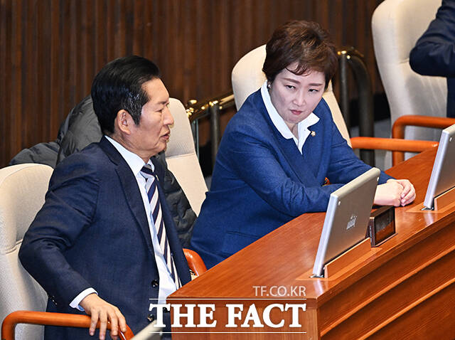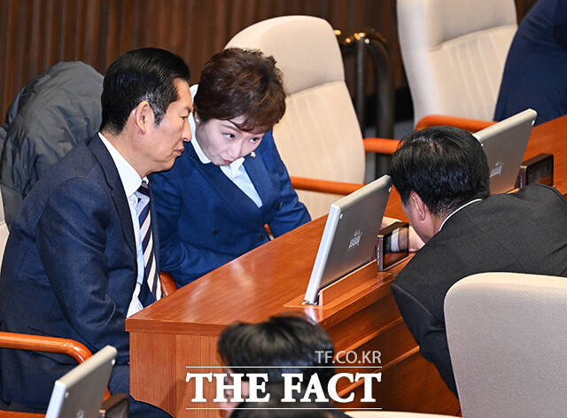[더팩트ㅣ국회=배정한 기자] 정청래 더불어민주당 대표(왼쪽)가 2일 오후 서울 여의도 국회에서 열린 제432회 국회(임시회) 제1차 본회의에 참석한 가운데 이언주 최고위원(왼쪽 두번째)이 등을 돌린채 황명선 최고위원(왼쪽 세번째)과 대화를 하고 있다.