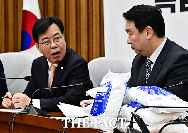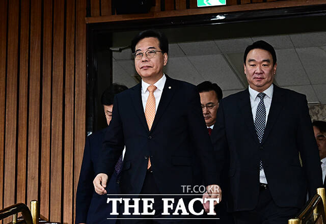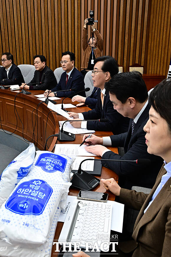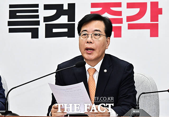 [더팩트ㅣ국회=배정한 기자] 송언석 국민의힘 원내대표(가운데)가 3일 오전 서울 여의도 국회에서 열린 원내대책회의에 참석해 모두발언을 하고 있다.