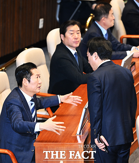 [더팩트 | 국회=배정한 기자] 정청래 더불어민주당 대표(왼쪽)가 3일 오전 서울 여의도 국회에서 열린 제432회 국회(임시회) 제2차 본회의에 참석해 박수현 의원과 대화를 하고 있다.