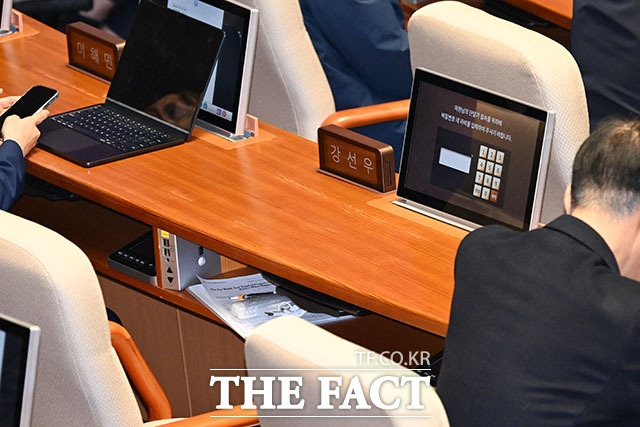 [더팩트ㅣ국회=남용희 기자] 제432회 국회(임시회) 제2차 본회의가 3일 오전 서울 여의도 국회에서 열린 가운데 강선우 무소속 의원의 자리가 비어있다.