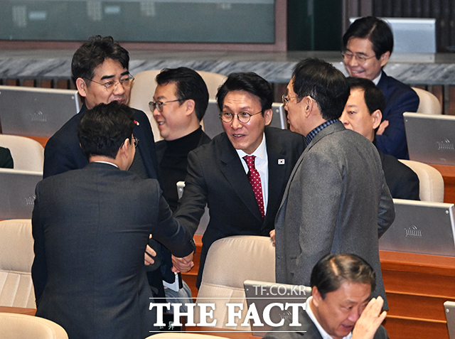 [더팩트 | 국회=배정한 기자] 김민석 국무총리(가운데)가 4일 오전 서울 여의도 국회에서 열린 제432회 국회(임시회) 제3차 본회의에 참석해 국민의힘 의원들과 대화를 하고 있다.