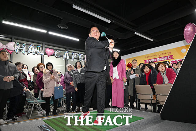 [더팩트ㅣ서예원 기자] 박강수 마포구청장이 4일 오후 서울 마포구 백범로에 마련된 ‘할카페’ 개소식에 참석해 골프 시연을 하고 있다.