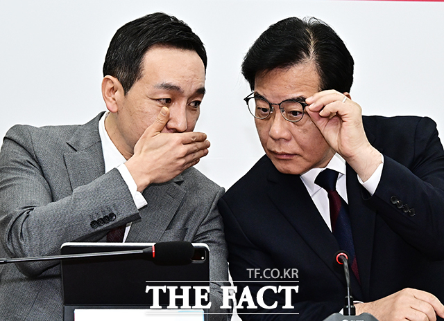 [더팩트 | 국회=배정한 기자] 김민수 국민의힘 최고위원(왼쪽)과 송언석 원내대표가 5일 오전 서울 여의도 국회에서 열린 최고위원회의에 참석해 대화를 하고 있다.