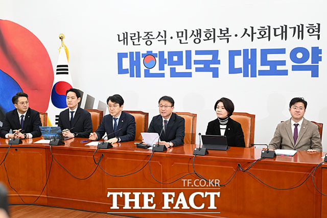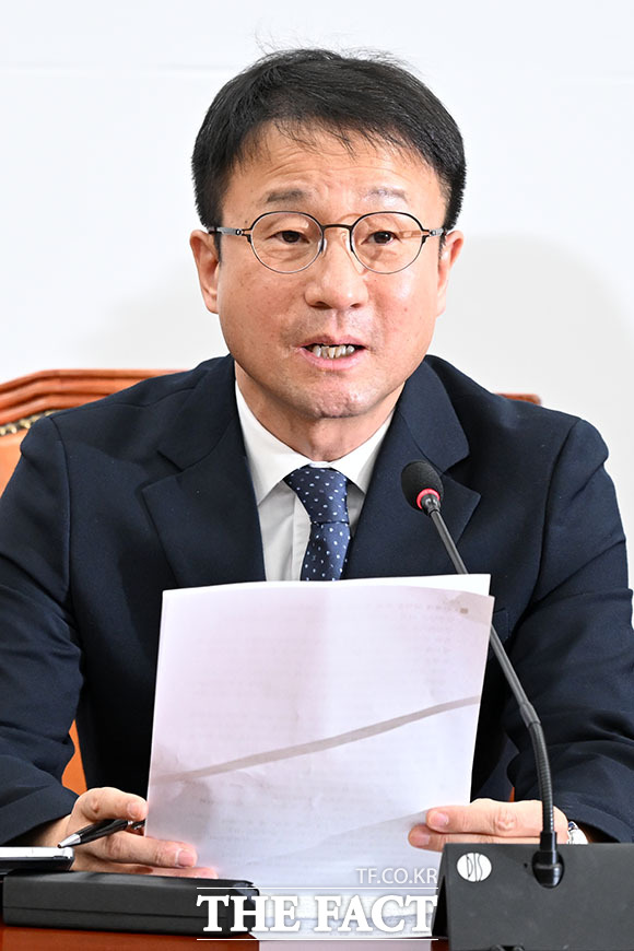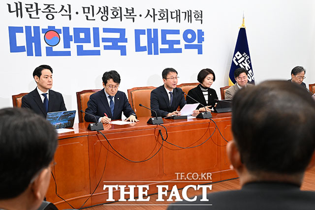 [더팩트ㅣ국회=남용희 기자] 한병도 더불어민주당 원내대표(가운데)가 5일 오전 서울 여의도 국회에서 열린 정책조정회의에 참석해 발언을 하고 있다.