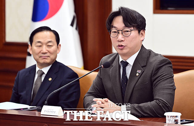 [더팩트ㅣ임영무 기자] 모경종 더불어민주당 전국청년위원장(오른쪽)이 6일 오전 서울 종로구 정부서울청사에서 열린 청년정책 관계장관회의에 참석해 발언을 하고 있다.