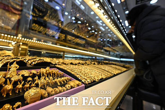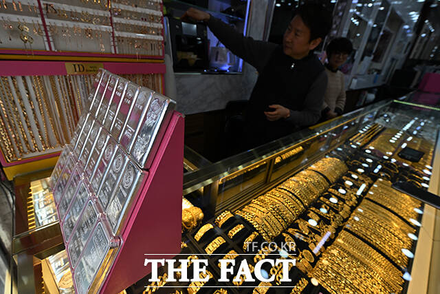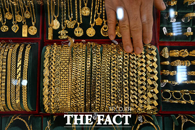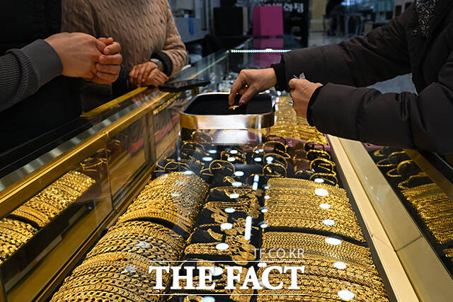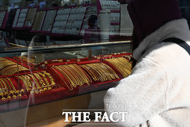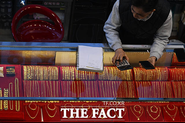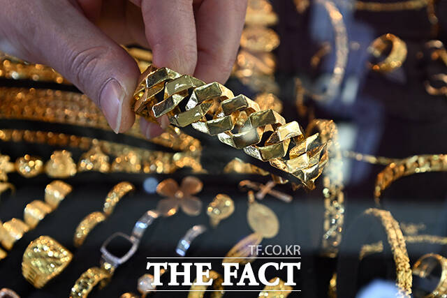 [더팩트ㅣ서예원 기자] 고공행진을 이어가던 금값이 급락과 반등을 오가고 있는 6일 오후 서울 종로구의 한 귀금속 매장에서 고객이 매도할 금 제품을 내놓고 있다.