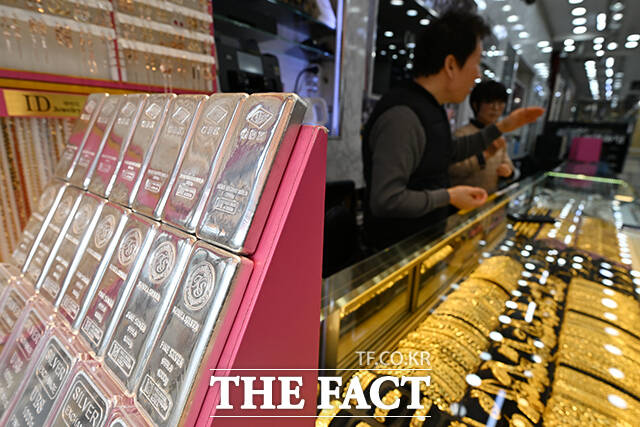 [더팩트ㅣ서예원 기자] 고공행진을 이어가던 금값이 급락과 반등을 오가고 있는 6일 오후 서울 종로구의 한 귀금속 매장에 은 제품이 진열되어 있다.