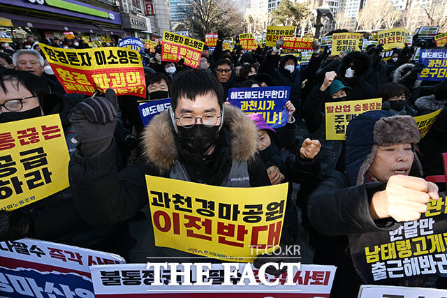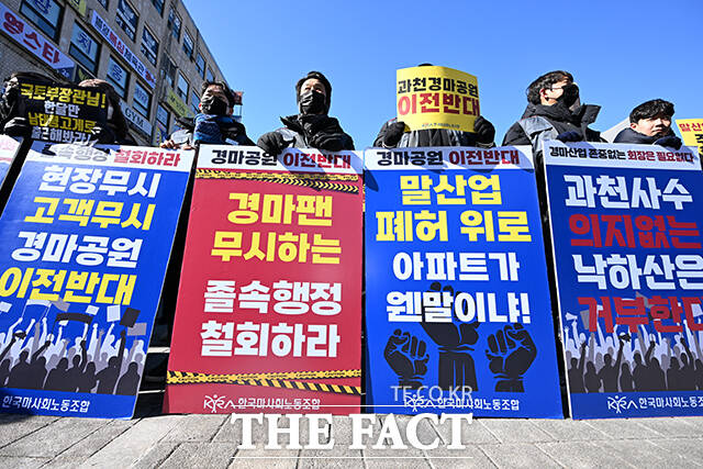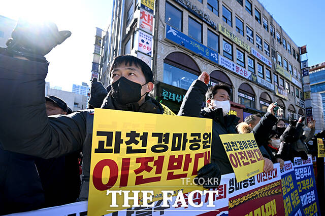 [더팩트ㅣ과천=서예원 기자] 한국마사회 노동조합과 과천시민들이 7일 오후 경기 과천시 중앙공원에서 열린 ‘이재명 정부의 과천경마공원 이전 반대 집회’에 참석해 손피켓을 들고 구호를 외치고 있다.