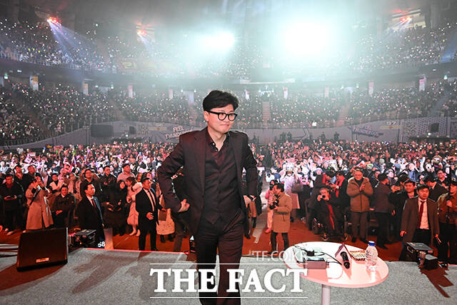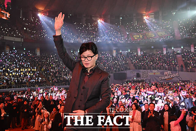 [더팩트ㅣ서예원 기자] 한동훈 전 국민의힘 대표가 8일 오후 서울 송파구 잠실종합운동장 실내체육관에서 열린 토크콘서트에 참석해 주먹을 들어보이고 있다.