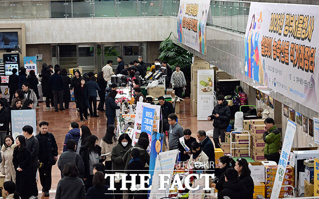 [더팩트ㅣ임영무 기자] 2026년 정부서울청사 설맞이 농축산물 직거래장터가 9일 오후 서울 종로구 정부서울청사 로비에서 열린 가운데 점심 식사를 마친 직원들이 명절 선물을 살펴보고 있다.