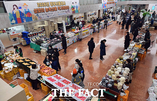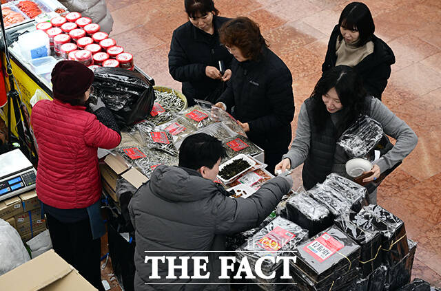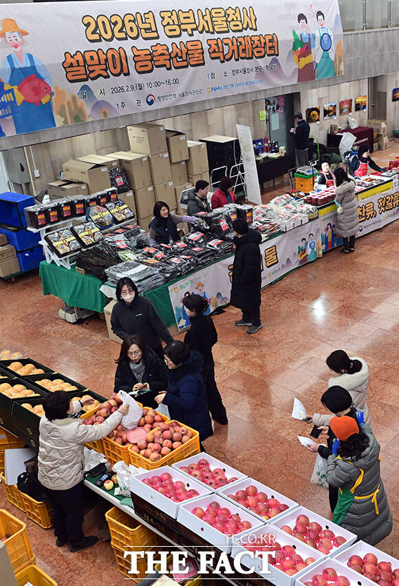 [더팩트ㅣ임영무 기자] 2026년 정부서울청사 설맞이 농축산물 직거래장터가 9일 오후 서울 종로구 정부서울청사 로비에서 열린 가운데 직원들이 명절 선물을 살펴보고 있다.