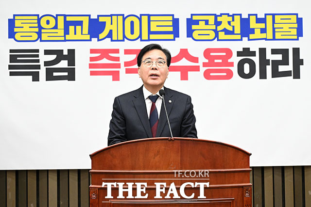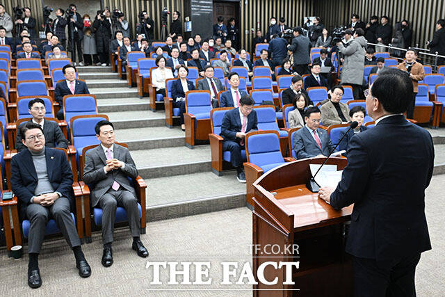 [더팩트ㅣ국회=남용희 기자] 송언석 국민의힘 원내대표가 9일 오후 서울 여의도 국회에서 열린 의원총회에서 모두발언을 하고 있다.