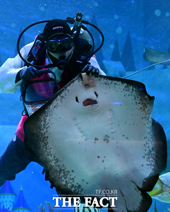 [더팩트ㅣ이새롬 기자] 10일 서울 강남구 씨라이프 코엑스 아쿠아리움에서 아쿠아리스트가 가오리 먹이주기를 선보이고 있다.
