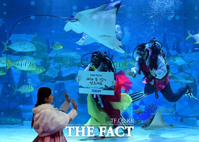 [더팩트ㅣ이새롬 기자] 10일 서울 강남구 씨라이프 코엑스 아쿠아리움에서 설 맞이 수중 공연이 열린 가운데, 아쿠아리스트들이 한복 차림의 관람객과 설 인사를 하고 있다.
