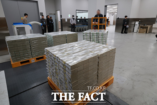 시중 은행으로 방출될 5만원권과 1만원권 신권 다발이 쌓여 있다.