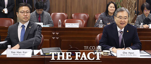 [더팩트ㅣ임영무 기자] 조현 외교부 장관(오른쪽)이 11일 오전 서울 종로구 외교부청사에서 열린 '한-네덜란드 외교·산업 2+2 회의'에 참석해 발언을 하고 있다. 왼쪽은 여한구 산업통상부 통상교섭본부장.