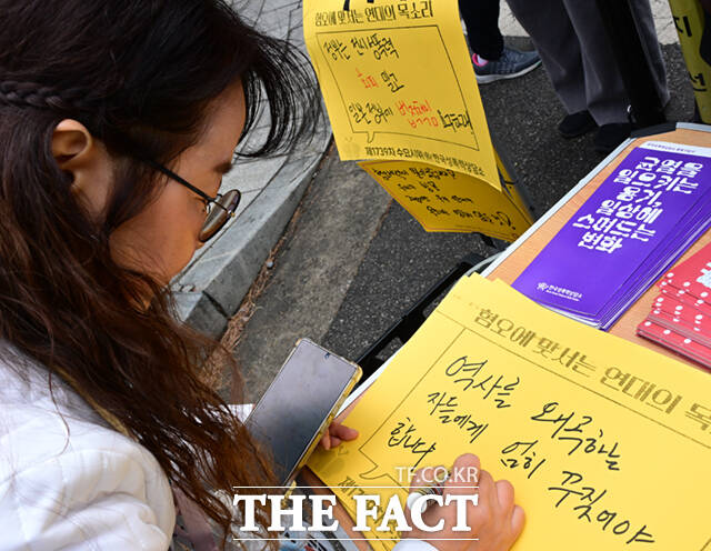 이어 "그러나 시민 여러분은 포기하지 않았다. 이 자리를 떠나지 않았고, 침묵하지 않았다. 그 결과 대통령실의 적극적인 관심이 시작됐고, 극우·역사부정 인사들이 마침내 경찰 조사를 받게 되자 맞불 집회는 일단 중단됐다"며 "시민의 요구가 국가 권력의 책임으로 전환되기 시작했음을 보여주는 중요한 변화"라고 강조했다.