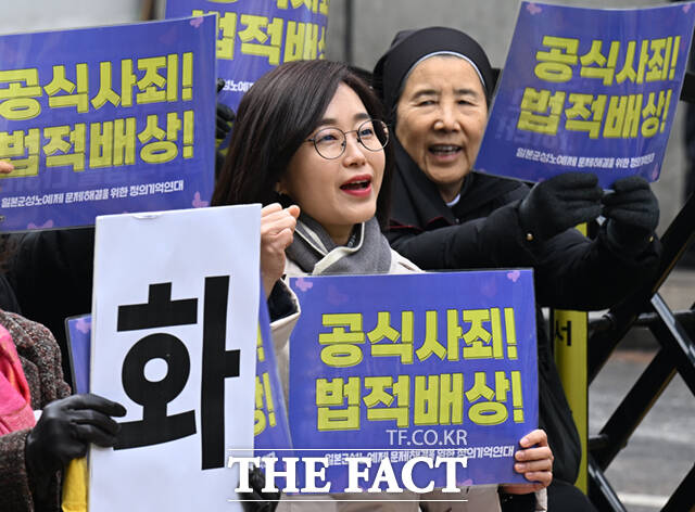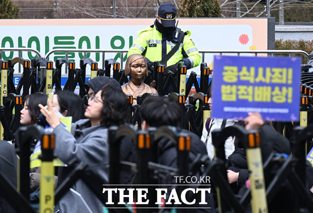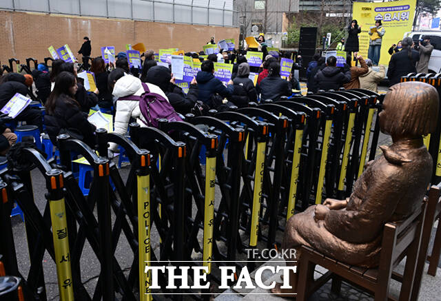 [더팩트ㅣ이새롬 기자] 11일 서울 종로구 주한일본대사관 인근 평화의 소녀상 앞에서 제1739차 일본군 성노예제 문제 해결을 위한 정기 수요시위가 열린 가운데, 참가자들이 피켓을 든 채 구호를 외치고 있다.