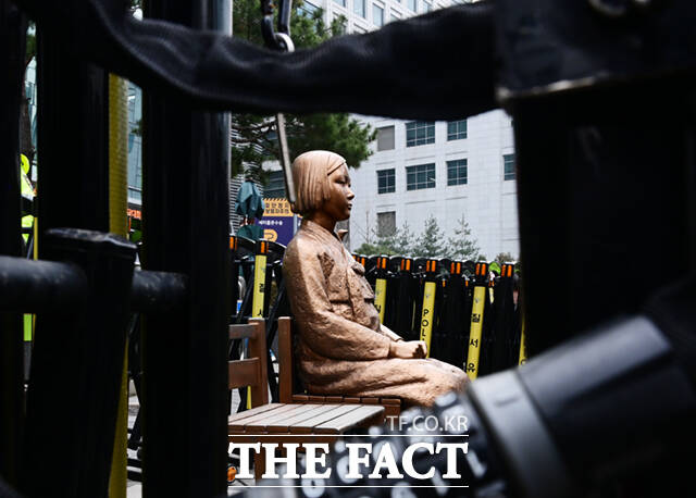11일 서울 종로구 주한일본대사관 인근 평화의 소녀상 앞에서 제1739차 일본군 성노예제 문제 해결을 위한 정기 수요시위가 열린 가운데, 반대 집회와 경찰 차벽 등이 사라져 깨끗해진 모습을 보이고 있다.