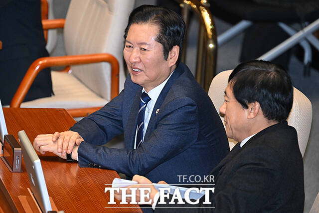 [더팩트ㅣ국회=남용희 기자] 정청래 더불어민주당 대표(왼쪽)와 이성윤 의원이 11일 오후 서울 여의도 국회에서 열린 교육·사회·문화 분야 대정부질문에서 대화를 나누고 있다.