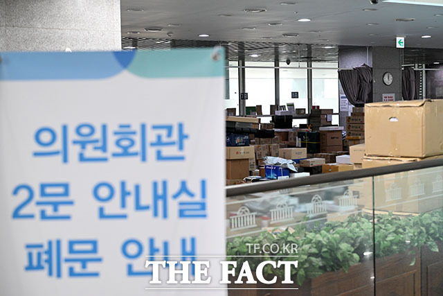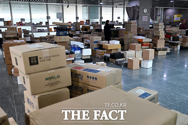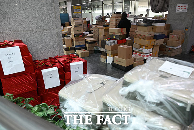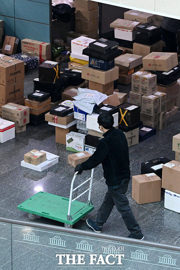 [더팩트ㅣ국회=남용희 기자] 설 명절 연휴를 이틀 앞둔 12일 오전 서울 여의도 국회 의원회관 로비에 각 의원실로 배달된 선물 택배 상자 등이 쌓여있다.