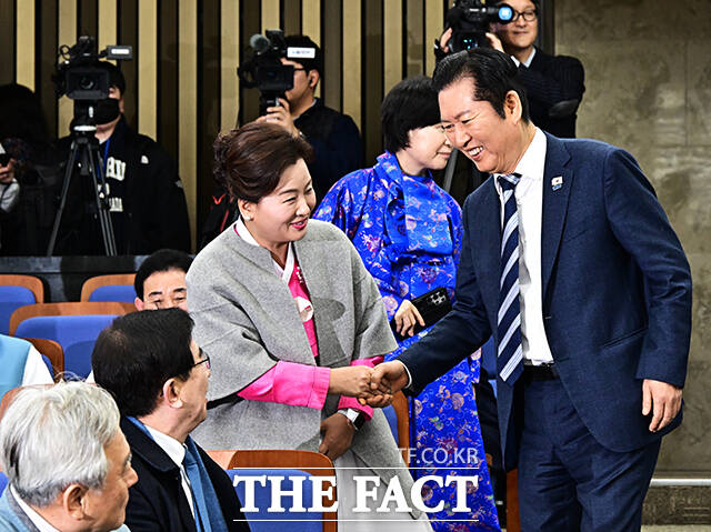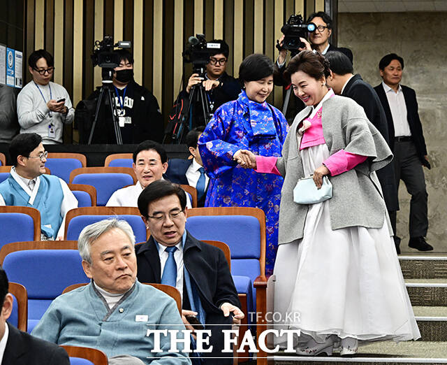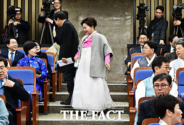 [더팩트ㅣ국회=배정한 기자] 한복을 입은 이수진 더불어민주당 의원이 12일 오후 서울 여의도 국회에서 열린 의원총회에 참석하고 있다.