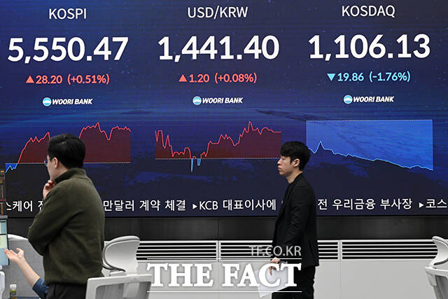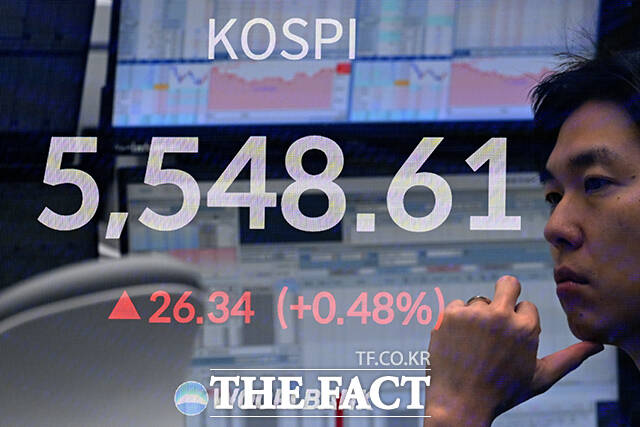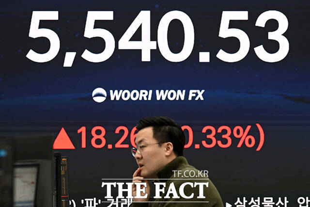 [더팩트ㅣ서예원 기자] 코스피 지수가 5500선을 돌파해 최고치를 경신하고 있는 13일 오전 서울 중구 우리은행 본점 딜링룸 전광판에 지수가 표시되고 있다.