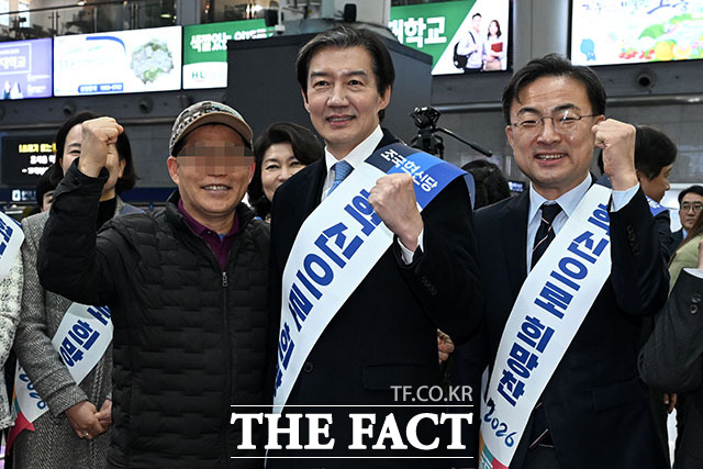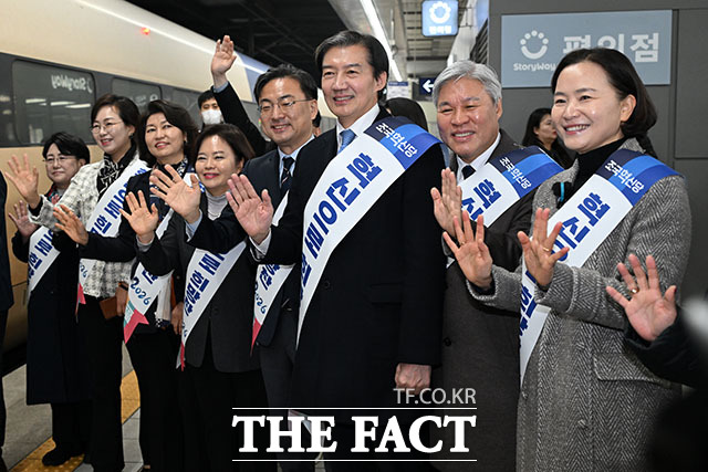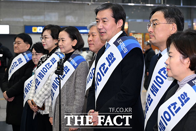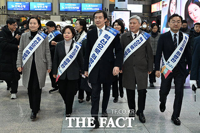 조국 조국혁신당 대표(오른쪽)를 비롯한 의원들이 13일 오전 서울 용산구 용산역에서 시민들에게 귀성 인사를 하고 있다. /남용희 기자