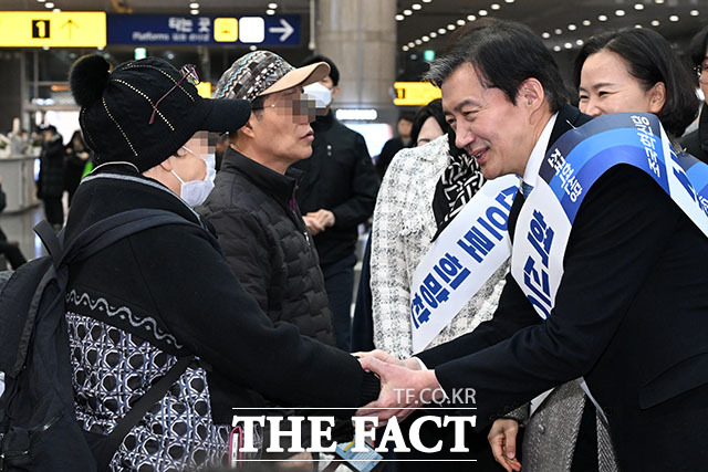 [더팩트ㅣ남용희 기자] 조국 조국혁신당 대표(오른쪽)를 비롯한 의원들이 13일 오전 서울 용산구 용산역에서 시민들에게 귀성 인사를 하고 있다.