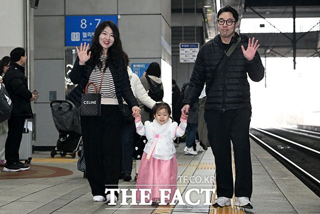 [더팩트ㅣ남용희 기자] 설 연휴를 하루 앞둔 13일 오전 서울 용산구 용산역에서 귀성길에 오르는 한 가족이 손을 흔들며 이동하고 있다.