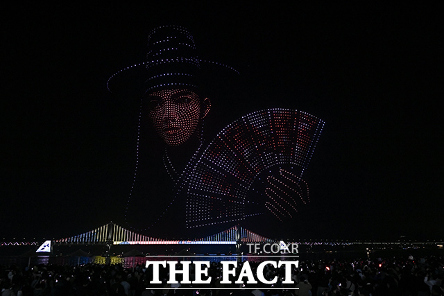 [더팩트 | 부산=박상민 인턴기자] 설 연휴 첫날인 14일 저녁 부산 수영구 광안리해수욕장에서 '광안리 M 드론라이트쇼' 특별 공연이 펼쳐지고 있다.