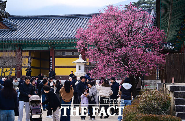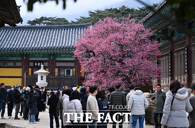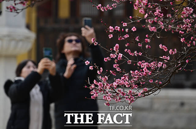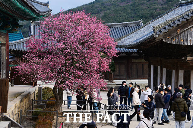 [더팩트ㅣ양산=박헌우 기자] 설을 하루 앞둔 16일 오후 경남 양산시 통도사에 '봄의 전령'으로 불리는 홍매화가 피어 있다.