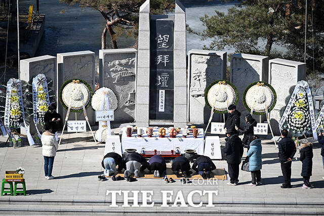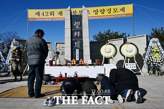 [더팩트ㅣ파주=남윤호 기자] 민족 대명절 설을 맞은 17일 오전 경기 파주시 임진각 망배단에서 열린 제42회 망향경모제를 찾은 실향민 가족이 차례를 지내고 있다.