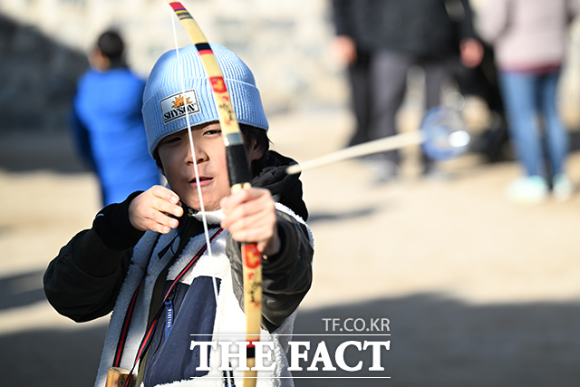 [더팩트ㅣ남윤호 기자] 설날인 17일 오후 서울 중구 남산한옥마을에서 열린 '2026 남산골 설축제'를 찾은 아이가 활 시위를 당기고 있다.